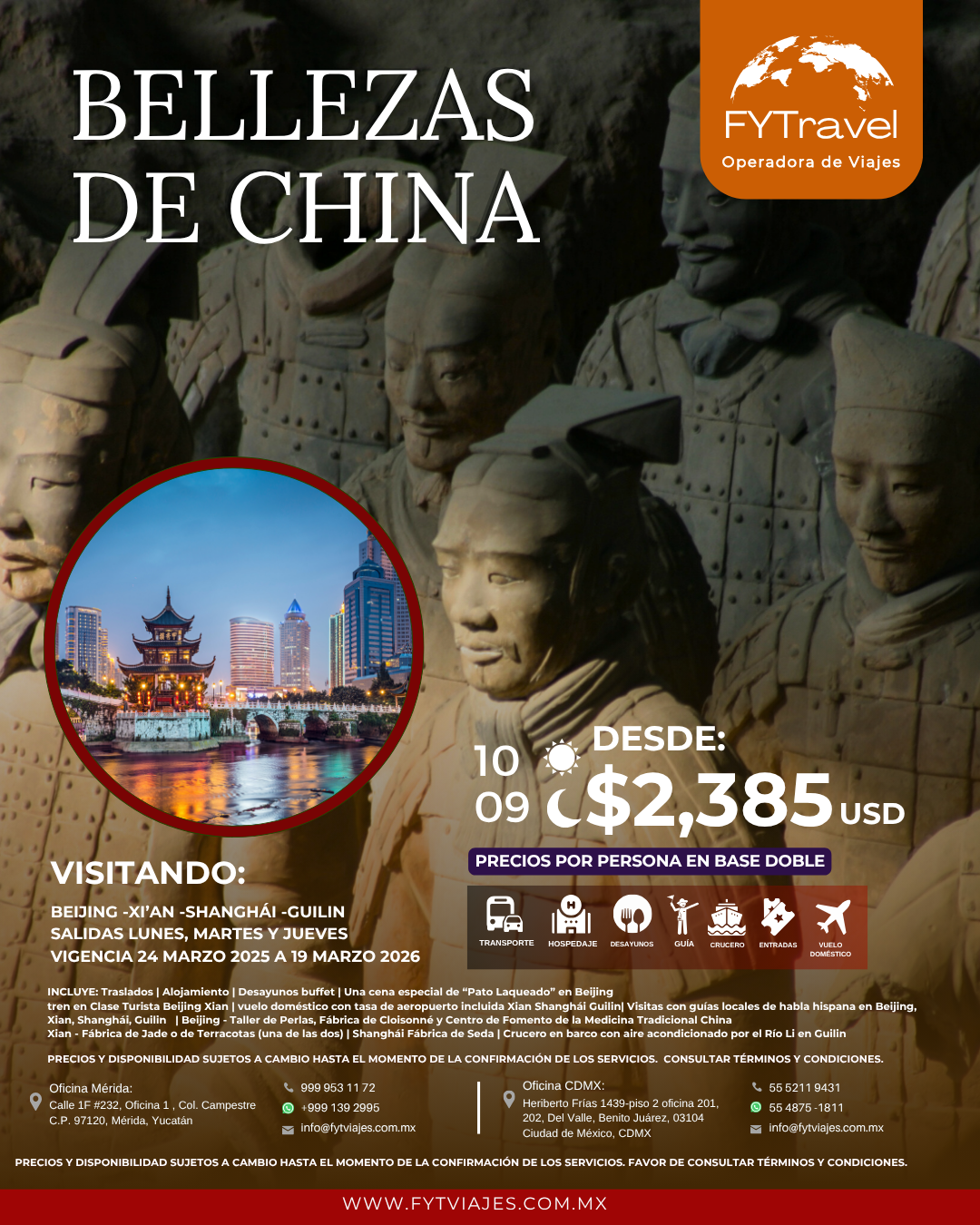 – Visitas con guías locales de habla hispana en Beijing, Xi’an, Guilin y Shanghai.