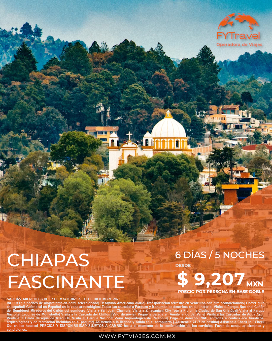 Adéntrate en un recorrido lleno de contrastes y sorpresas. Explora ciudades coloniales, paisajes naturales impactantes y vestigios mayas que cuentan historias milenarias. Desde la selva profunda hasta los ríos cristalinos, cada parada te conectará con la magia única de Chiapas. Una experiencia completa para descubrir lo más auténtico y fascinante del sur de México. ¡Déjate maravillar!