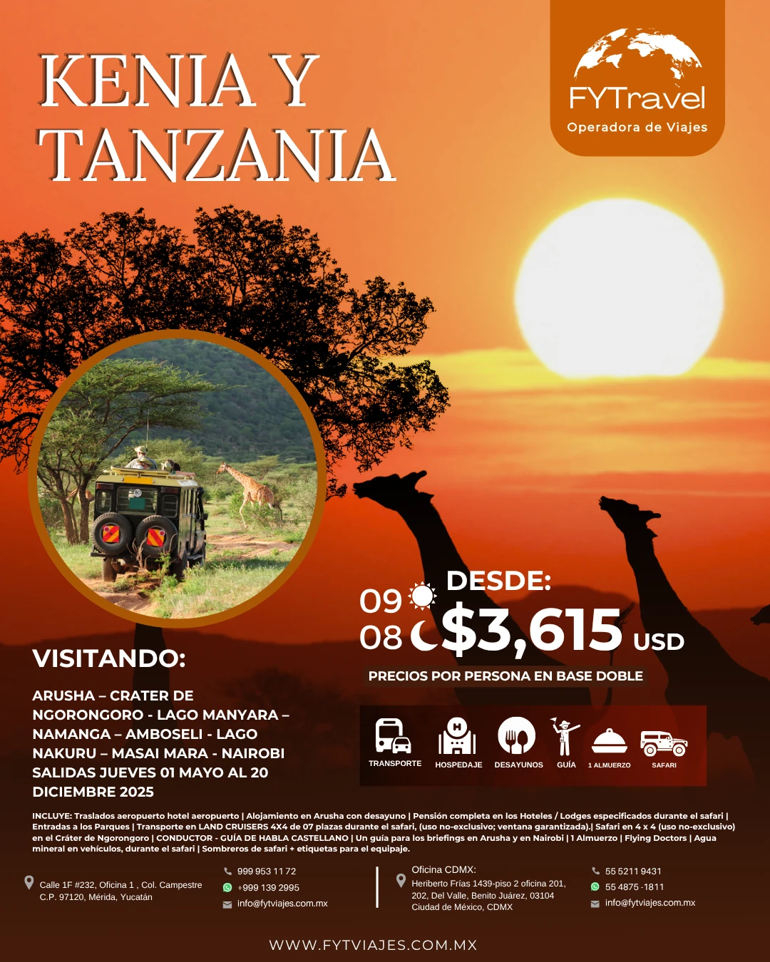 Conductor-guía de habla hispana (si la salida se compone de más de un vehículo, el guía se irá cambiando de coche durante el recorrido, entre 2 en Kenya y entre 3 en Tanzania)