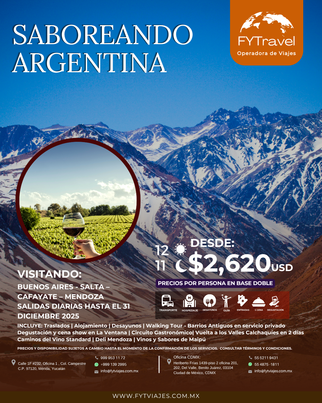 ¡Embárcate en un viaje único por Argentina con este itinerario lleno de historia, cultura y gastronomía! En Buenos Aires, recorrerás los barrios más antiguos de la ciudad, descubrirás la magia de San Telmo y te deleitarás con un exquisito menú de platos locales. Luego, viajarás a Salta para explorar su rica gastronomía, participar en una clase de cocina regional y disfrutar de un tour por los Valles Calchaquíes. El viaje continúa en Cafayate, donde descubrirás los secretos del vino y la producción de queso de cabra. Finalmente, Mendoza te sorprenderá con sus bodegas premiadas, degustaciones exclusivas y un recorrido por los sabores de la región. Un itinerario que te llevará de la mano por lo mejor de la tradición argentina.