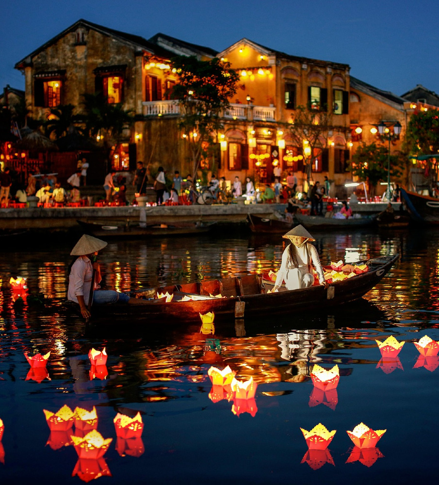 A la salida del sol y para aquellos que estén interesados hay una clase de Tai chi en la terraza solárium. Tendremos un buen brunch para recargar baterías y emprender el retorno a tierra. Desembarcamos en el muelle de Halong, desde donde nos trasladamos a Hanói por carretera hasta el aeropuerto para tomar el vuelo a Da Nang. A su llegada, tenemos el traslado directo hasta Hoi An. Al anochecer, traslado al río Hoai, por donde navegaremos. Cuando cae la noche, las calles se iluminan con farolillos y luces de colores, también se lanzan linternas al agua para pedir buenos augurios. La ciudad luce un nuevo aspecto brillante y misterioso. Desembarque y tiempo libre para pasear por la calle y volver al hotel por su cuenta. Alojamiento.