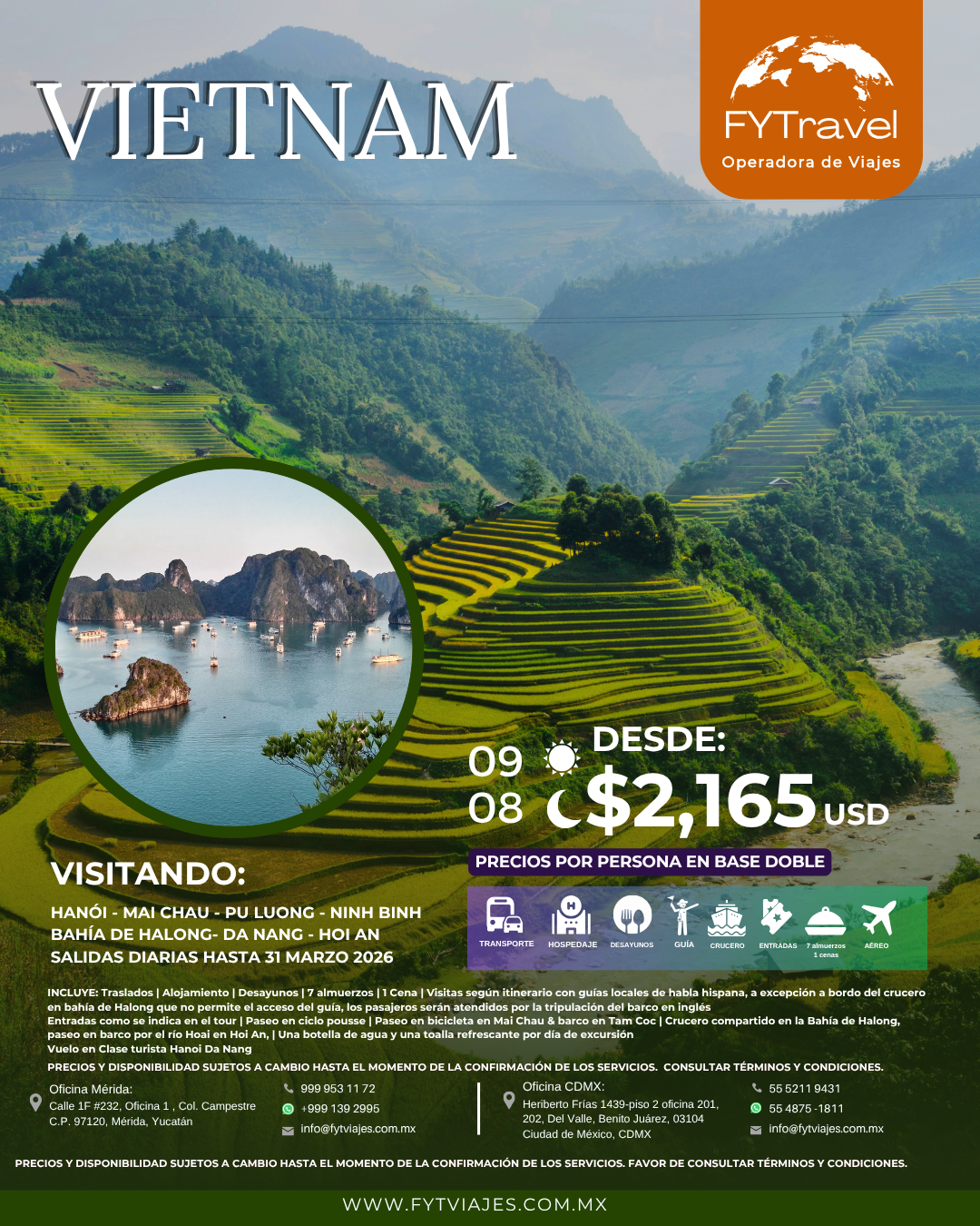Descubre lo mejor de Vietnam, comienza tu aventura en Hanói, la vibrante capital, explorando su rica historia y cultura, desde el Templo de la Literatura hasta el Lago Hoan Kiem. Luego, sumérgete en la serenidad de Mai Chau y Pu Luong, donde podrás interactuar con las tribus locales y disfrutar de paisajes impresionantes. Continúa hacia Ninh Binh, conocida como la «Bahía de Halong en tierra», y navega por sus cautivadoras grutas. Relájate en un crucero por la majestuosa Bahía de Halong antes de aterrizar en Da Nang y Hoi An, donde los farolillos iluminan la noche y las calles te transportan a otro tiempo.